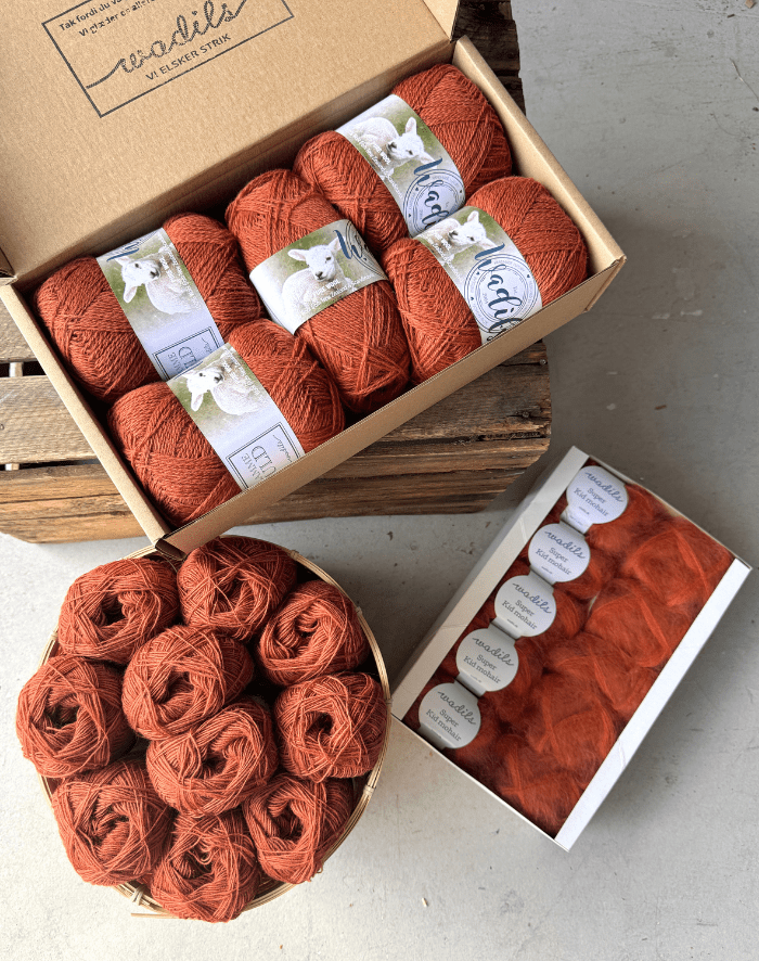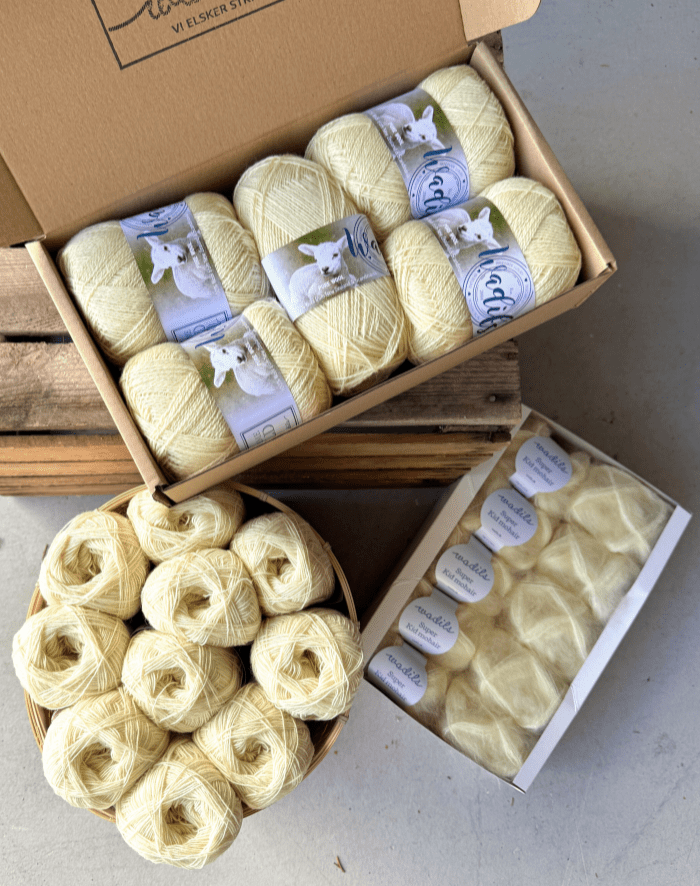 I pakken får du både 500 g Lammeuld, 10 nøgler Uno Lammeuld samt 10 ngl super kid mohair.