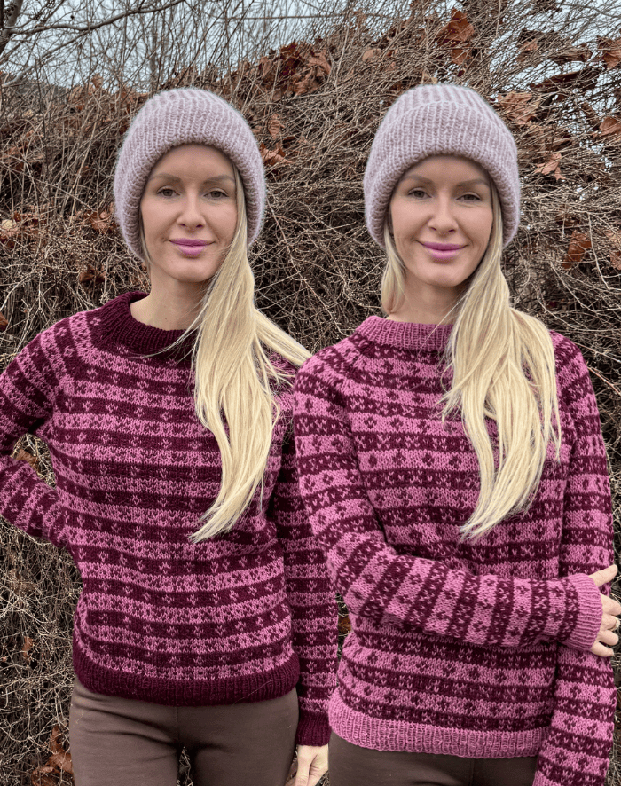 Saga Sweater er strikket i glatstrikning med ribkanter. Den strikkes rundt på rundpinde, nedefra og