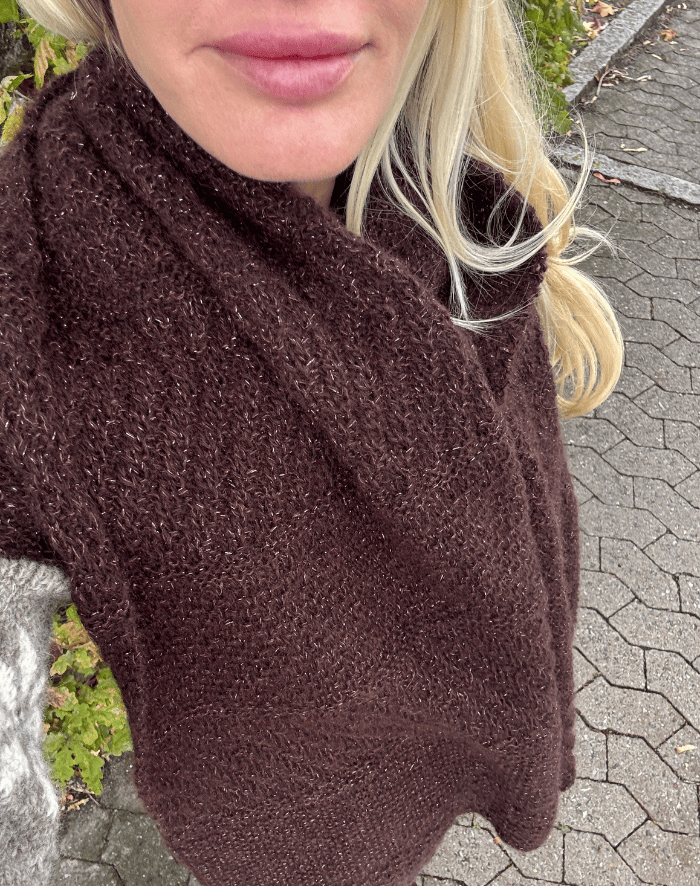 Struktur Halstørklædet bestå af en sammensætning af ret og vrang mønstre, og strikket i Wadils Silk Mohair, Uno Lammeuld og en Glittertråd.