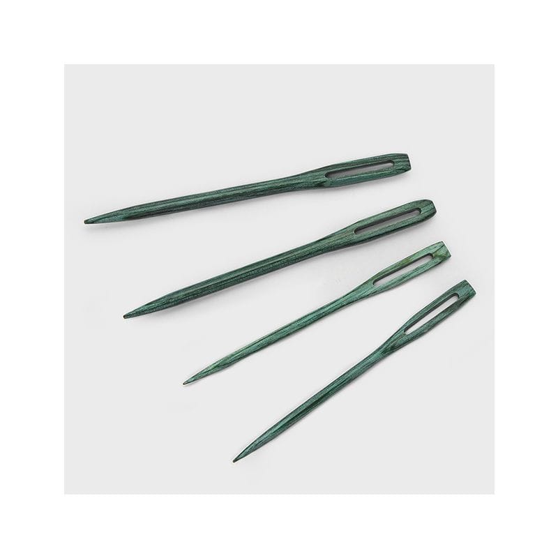 KnitPro Mindful stoppenåle er fremstillet i slidstærkt, lamineret træ og har en smuk teal farve. Sættet indeholder to små og to store nåle, som dækker de fleste behov til montering, hæftning og syning i strik. Nålene leveres i et genanvendeligt, cylindrisk træetui med dekorativt blomstermotiv – praktisk til opbevaring og nem at tage med.